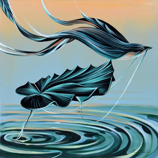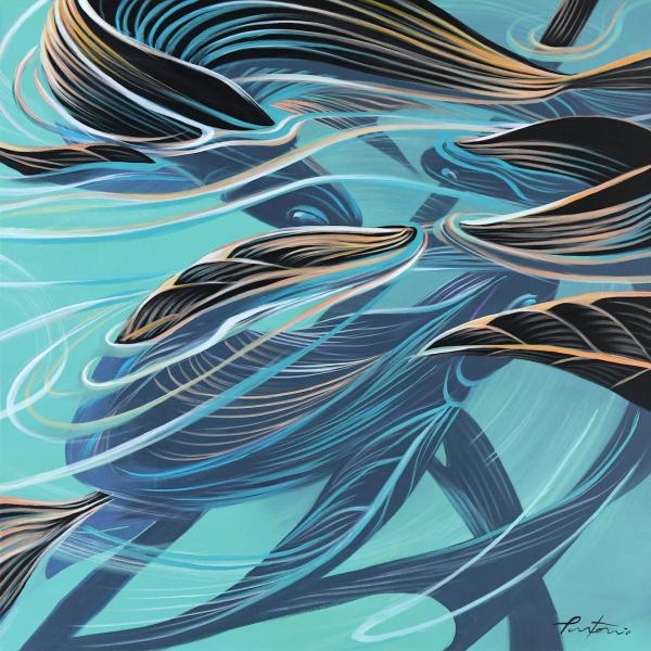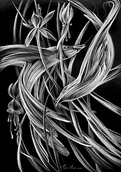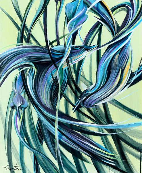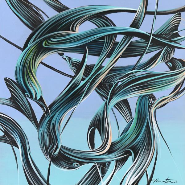 Pantonio est depuis toujours influencé par le fleuve Tage qui traverse le Portugal. Il crée au pinceau des personnages, des animaux fantastiques, des lapins, des poissons, des tortues, toujours en mouvement. On y aperçoit parfois des traits façon cordages qui évoquent la pêche et le monde marin si cher à la tradition portugaise. L’utilisation volontaire de quatre couleurs dominantes, bleu, noir, blanc et rouge, n’est pas sans rappeler le bleu sombre de la mer, le noir des fonds marins et le rouge volcanique du centre de la Terre.